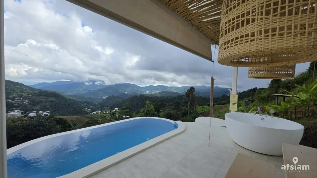- บ้านกล่อง : สำหรับใครที่ชอบความ Private และอยากได้รูปสวยๆ ลงโซเชียล ห้องนี้ตอบโจทย์มาก ตัวห้องเป็นสไตล์มินิมอลสีขาวสะอาดตา มีอ่างอาบน้ำตั้งอยู่ริมหน้าต่างกระจกบานใหญ่ สามารถแช่น้ำอุ่นๆ ไปพร้อมกับมองวิวภูเขาได้แบบไม่มีอะไรกั้น