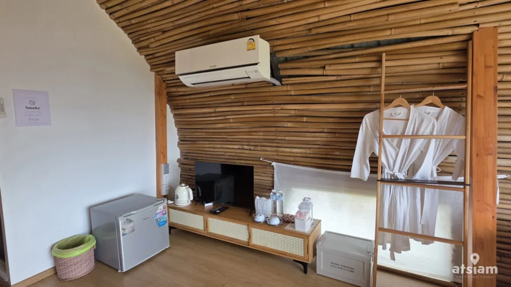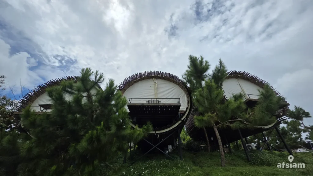 ถ้าเบื่อห้องสี่เหลี่ยมแบบเดิมๆ ต้องมาลองนอน “บ้านแคปซูลไม้ไผ่“ ของที่นี่ วัสดุทำจากไม้ไผ่ทั้งหลัง รูปทรงโค้งมนดูแปลกตาแต่ถ่ายรูปขึ้นสุดๆ ภายในกว้างขวาง มีสิ่งอำนวยความสะดวกครบ ทั้งน้ำอุ่นและไฟฟ้า หรือถ้าอยากเปลี่ยนบรรยากาศไปนอนเต็นท์กระโจมสีขาวแนว Glamping ที่นี่เขาก็มีจัดไว้ให้เลือกตามความชอบเลย