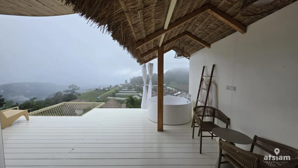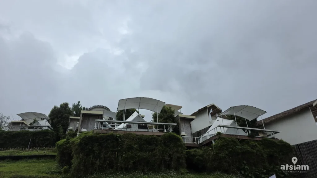 ทำเลของที่นี่ตั้งอยู่บนเนินเขาที่เห็นวิวได้กว้างมาก ยิ่งถ้าไปช่วงลุ้นทะเลหมอกนะ แค่เปิดประตูห้องออกมาก็เจอหมอกขาวๆ ลอยมาทักทายถึงระเบียง ไม่ต้องตื่นเช้าเพื่อขับรถไปจุดชมวิวที่ไหนเลย เพราะจุดชมวิวที่ดีที่สุดอยู่ตรงหน้าห้องนอนแล้ว