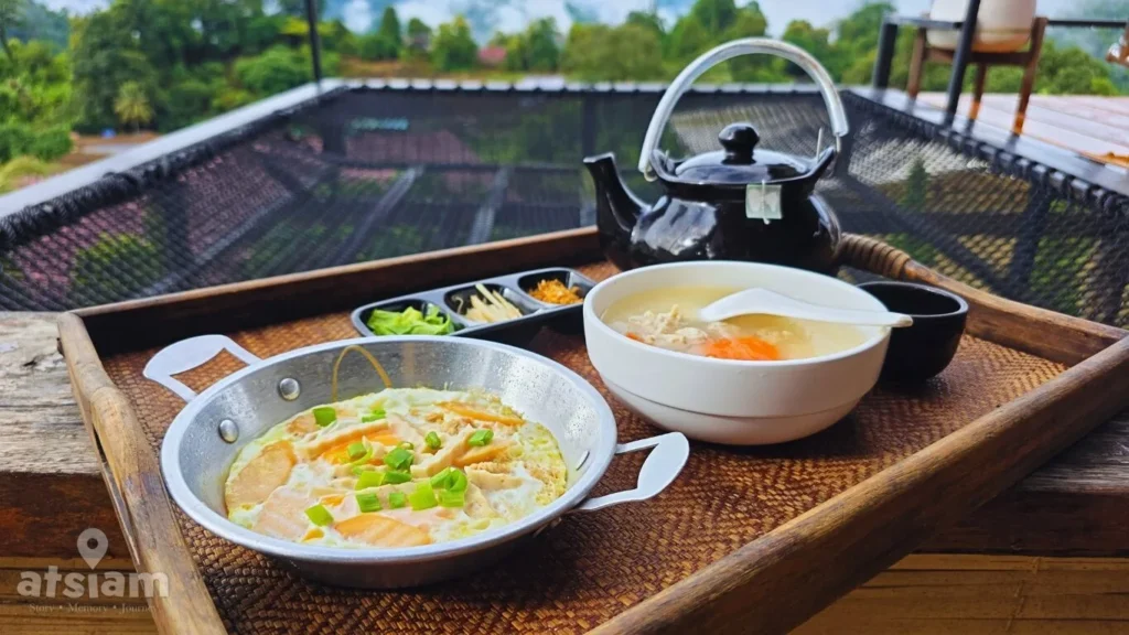 ที่พักมีบริการอาหารแบบเรียบง่าย เช่น อาหารตามสั่ง และชุดหมูกระทะ ซึ่งเป็นตัวเลือกที่เหมาะกับบรรยากาศบนเขา